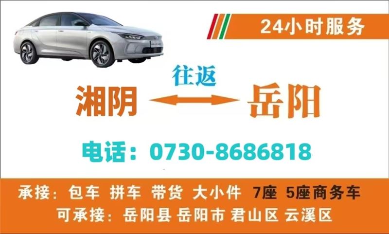 湘阴至岳阳商务车电话:0730-8686818支持散客拼车,包车,小件带货,每天两地往返,市县城区内包接送,全程高速直达,方便快捷,全天24小时为您服务。